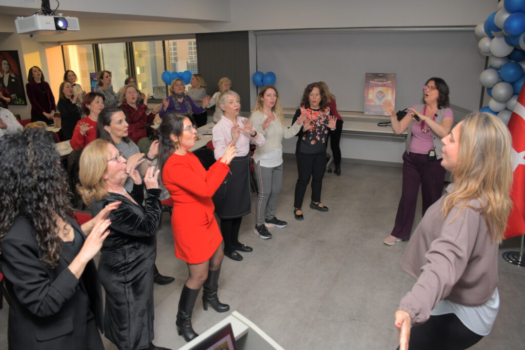 Etkinliğin ikinci kısmında “Kahkahanın Biyokimyası, Kadın Dayanışmasının En Neşeli Hali” başlıklı bir sunum yapan Prof. Dr. Yasemin Akçay ve Mehtap Bolgezen Bilgili de katılımcılarla birlikte Kahkaha Yogası çalışması gerçekleştirdi.