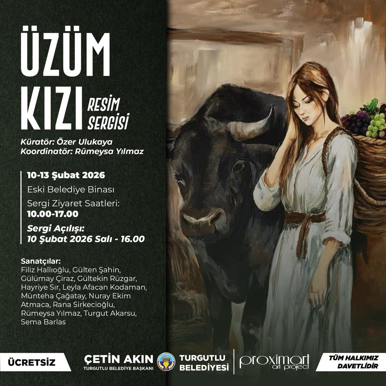 ‘Üzüm Kızı’ resim sergisi, yerelden evrensele uzanan bir anlatıyla, sanatın birleştirici gücünü Manisa Turgutlu’da buluşturuyor. Küratörlüğünü Özer Ulukaya’nın, koordinatörlüğünü Rümeysa Yılmaz’ın yaptığı sergi, 10-13 Şubat tarihleri arasında Turgutlu Eski Belediye Binası’nda sanatseverlerle buluşuyor. 13 sanatçının (Filiz Hallıoğlu, Gülten Şahin, Münteha Çağatay, Gülümay Çiraz, Gültekin Rüzgâr, Hariye Sır, Leyla Afacan Kodaman, Nuray Ekim Atmaca, Rana Sirkecioğlu, Sema Barlas, Turgut Akarsu, Rümeysa Yılmaz, Sema Barlas) özgün yorumlarıyla şekillenen sergide üzüm yalnızca bir meyve değil; kadın emeğinin, doğayla kurulan kadim bağın ve yöresel belleğin simgesi olarak ele alınıyor.